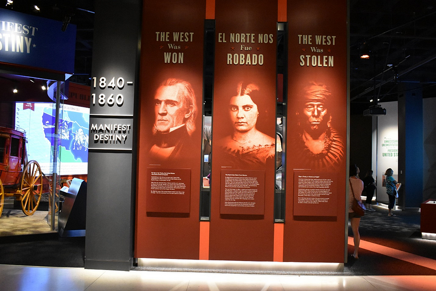 The Saint Louis Gateway Arch, completed in 1965, initially started off as a part of the Jefferson National Expansion Memorial and gained status as a national park through the NPS in 2018. The Gateway Museum, also finished in 2018, is comprised of six exhibits, ranging from the colonial era and riverfront era to the inception of the park. Throughout most of these exhibits, as well as the central displays outside of them, there is acknowledgement of controversy between Anglo settlers and Native Americans during the early days of Saint Louis, as well as discussion regarding the role of slavery in the early days of the nation. Furthermore, within the exhibit entitled Manifest Destiny, a specific focus is placed on the notion that land was stolen by Americans. [4] Along the outside of the wall, facing the central walkway, there is a large display that offers the Anglo-centric view of westward expansion, followed by the history of Mexico losing its large swaths of land to America, and capped off by the history of Native Americans being forced to sign treaties. (See photograph below) Thus, it can be seen that the museum generally attempts to produce solid history in regard to Saint Louis’ (as well as the country’s) complex relationship with Native Americans throughout the early days of the Republic.
